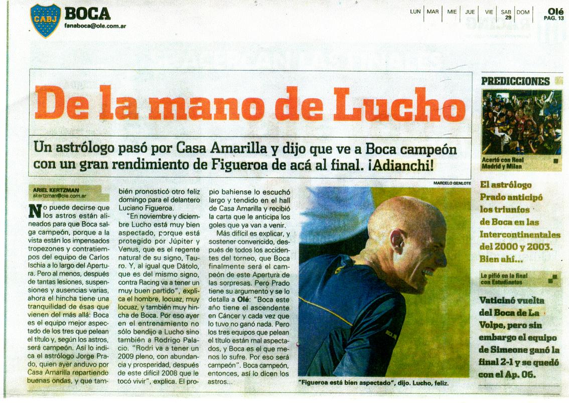 En lo personal, como Astrólogo, me gustaría que el año 2008, cuando Boca Juniors cumpla los 103 años de vida, lo dirigiera el Técnico Carlos Bianchi, el mas exitoso de Argentina y del mundo, 9 títulos en Boca Junios y 6 en Vélez Sarfield porque en este año el Ascendente Astral, estará en el signo de Cáncer donde nunca pudo ganar nada, Yo creo que estando alineados, todos juntos para ganar un campeonato, Directivos, Cuerpo Técnico y Jugadores, se puede revertir ese complicado Ascendente del Signo Cáncer, porque los planetas en su transito por la Eclíptica, inclinan para que se den determinados resultados, pero no son determinantes, está la energía que pongan las personas para lograr alcanzar el éxito como es un campeonato o obtener el reconocimiento público.